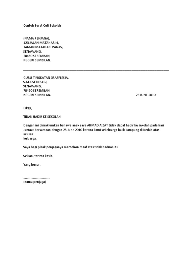 Uolls boleh rujuk pekeliling perkhidmatan bilangan 15 tahun. Surat cuti sekolah mestilah ditulis dengan format dan mengikut contoh surat kiriman rasmi tidak hadir ke sekolah yang terbaik. Contoh Surat Memohon Cuti Sekolah Kerana Balik Kampung Contoh surat tidak hadir ke sekolah 2.