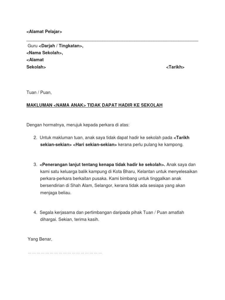 70 Jalan Mega Jaya 1 Taman Mega. _____ Guru Kelas _____. Contoh Surat Tidak Hadir ke Sekolah 2 Sebab Balik Kampung Ahmad Khalid 1103 B Lorong Alor Akar 33 25250 Kuantan Pahang.